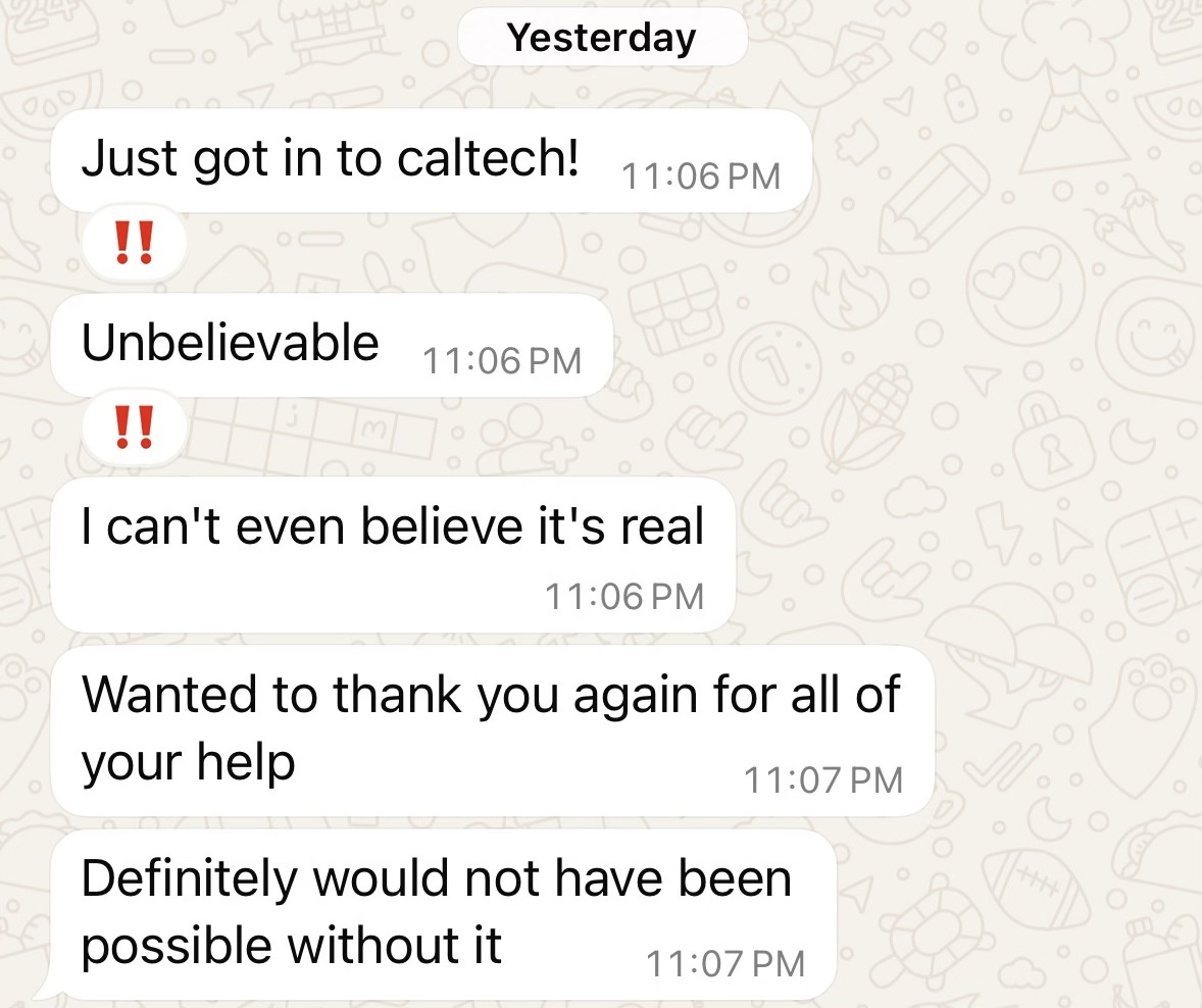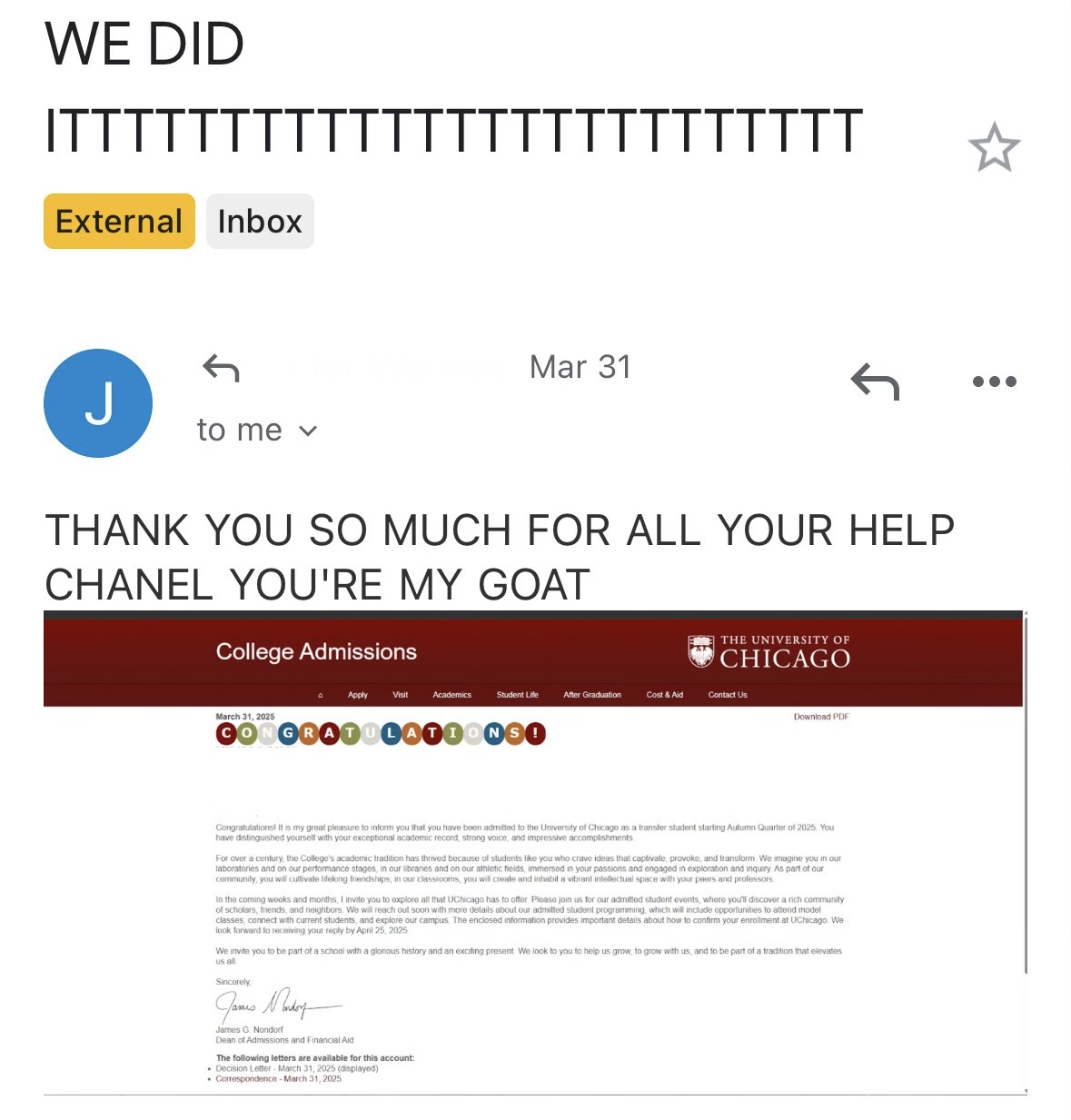As a CS major, I needed to develop a strong EC but didn’t know what would help me stand out. The Goat helped me frame my work in AI and software development in a way admissions officers understood and valued. That perspective was a game changer - I'm now at Columbia