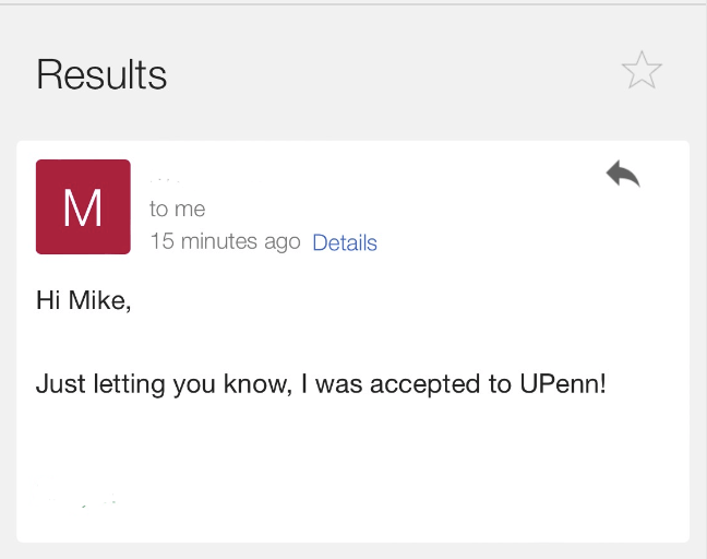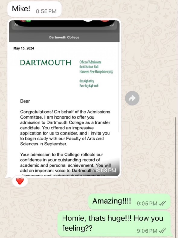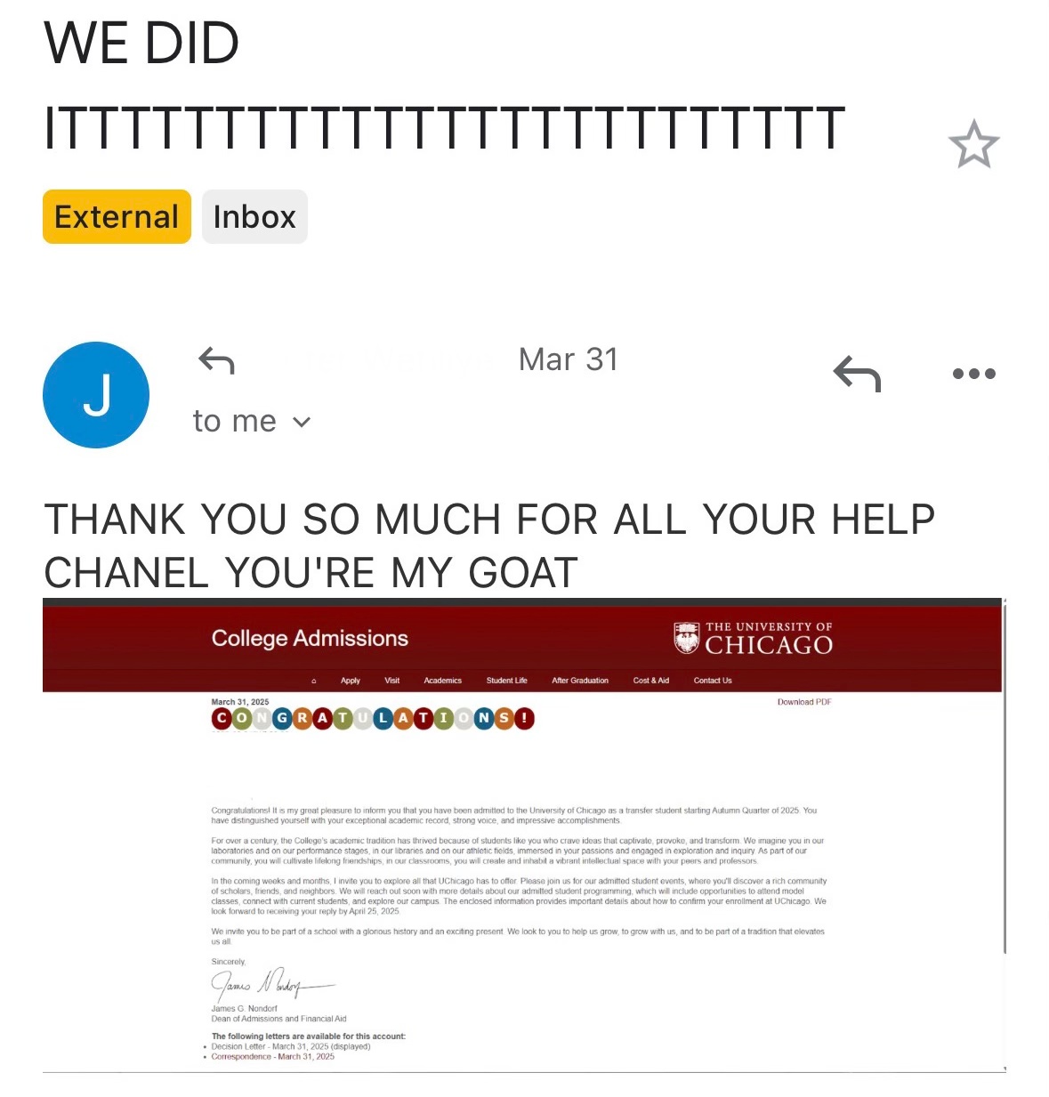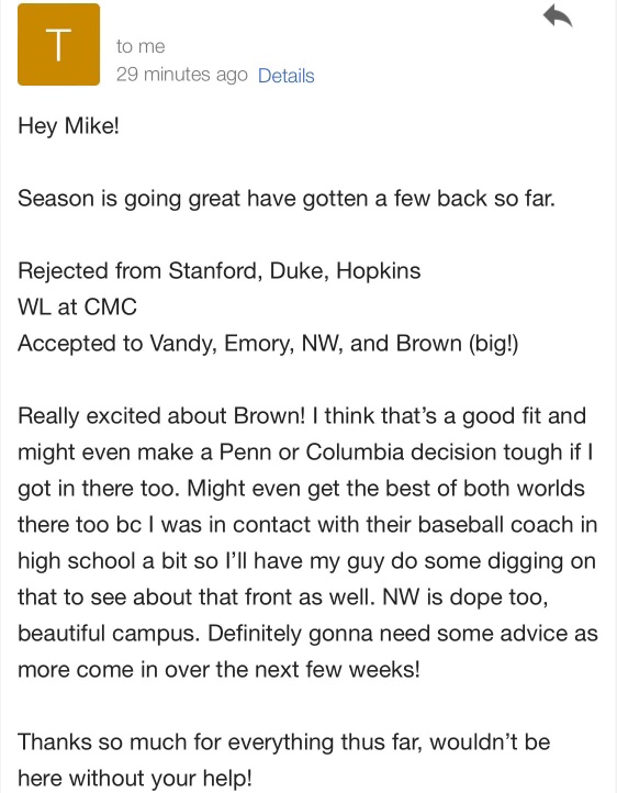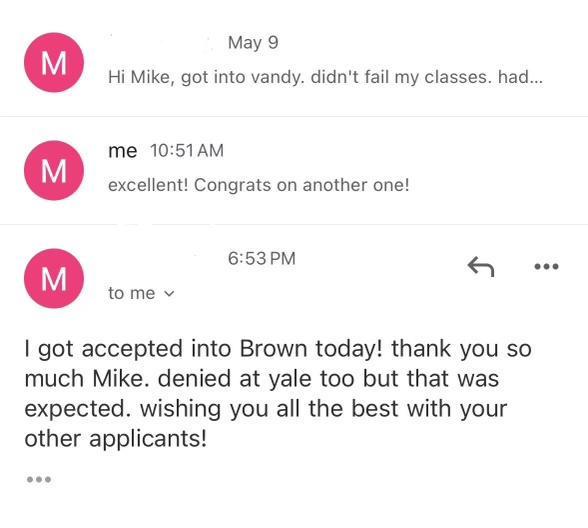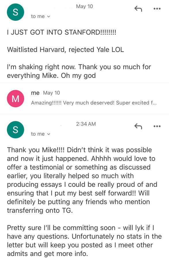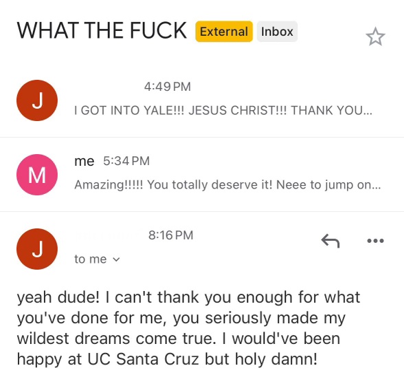 “I can’t thank you enough for what you’ve done for me, you seriously made my wildest dreams come true. I would’ve been happy at UC Santa Cruz but holy damn!… It’s been four days and I’m still freaking out at everything you’ve done for me. Please let me know if I can do anything to help you out or pay it forward. You are my goddamn hero!!!!!!”