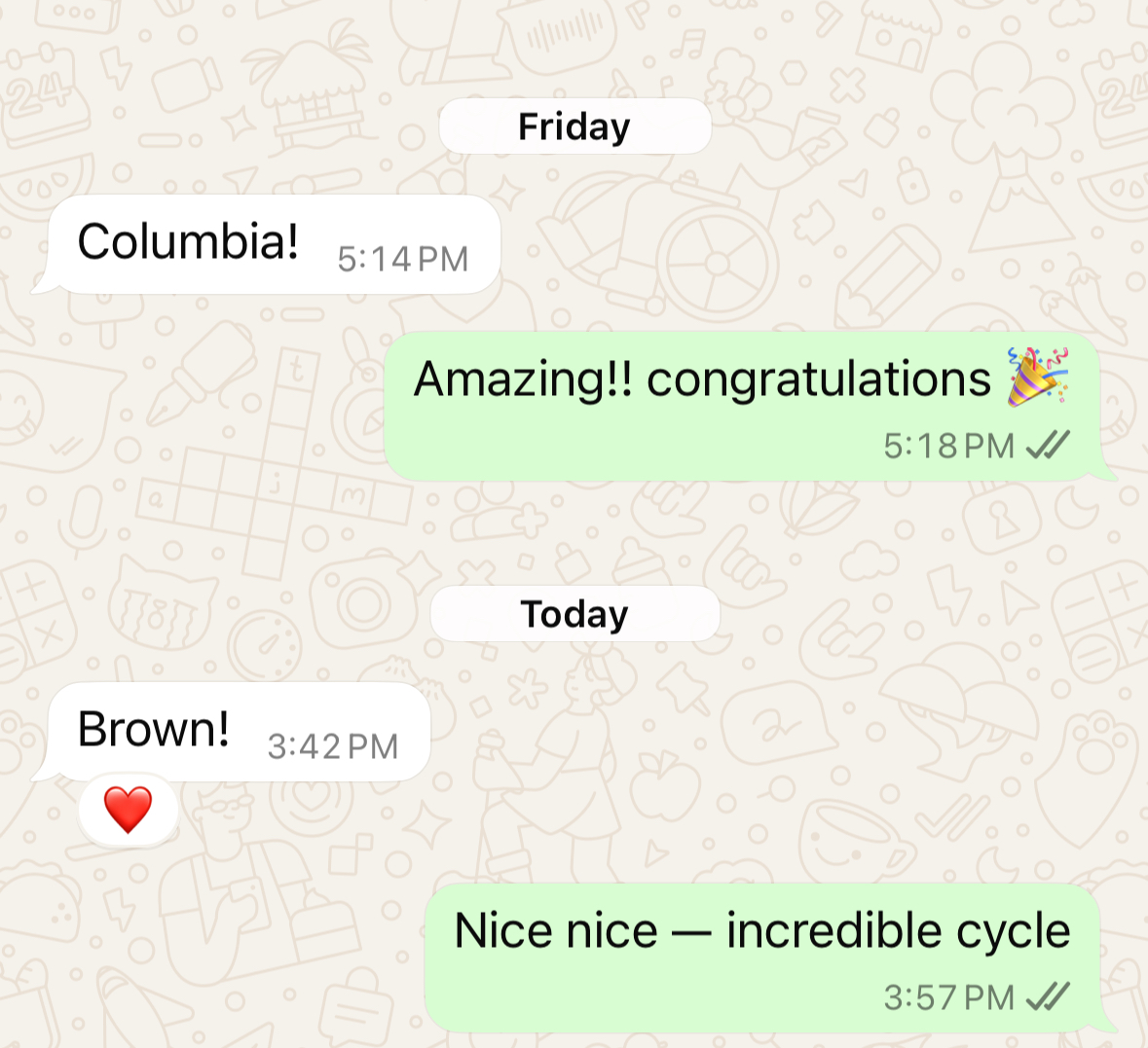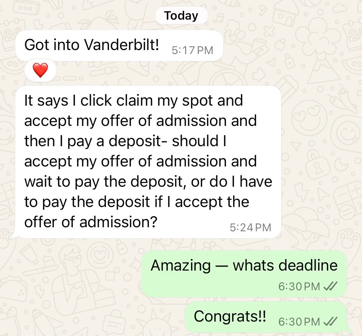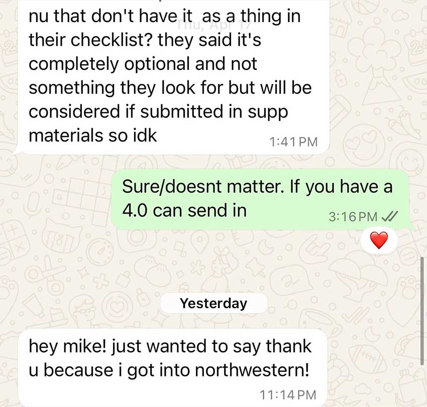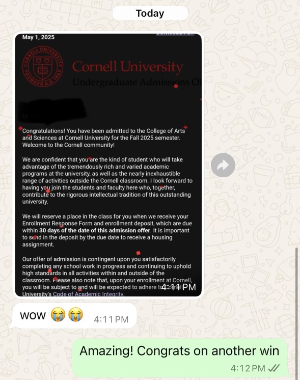 “I can’t thank you enough for what you’ve done for me, you seriously made my wildest dreams come true. I would’ve been happy at UC Santa Cruz but holy damn!… It’s been four days and I’m still freaking out at everything you’ve done for me. Please let me know if I can do anything to help you out or pay it forward. You are my goddamn hero!!!!!!”