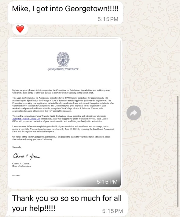 Our approach focuses on personalized, targeted guidance for every applicant. Transfer applicants receive tailored support regarding target school selection, course scheduling, extracurricular growth, essay development, and copy editing.